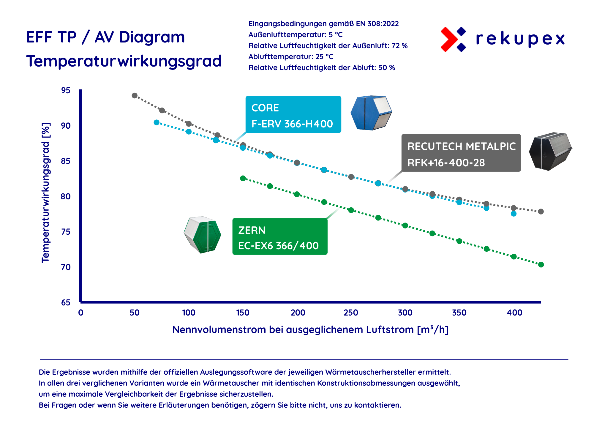 Aus dem Vergleich wird deutlich, dass die einzelnen Hersteller ihre Tauscher für unterschiedliche Betriebsbedingungen optimieren. Manche Tauscher erzielen sehr gute Ergebnisse insbesondere bei niedrigeren Luftvolumenströmen, andere sind für mittlere und höhere Luftvolumenströme optimiert.