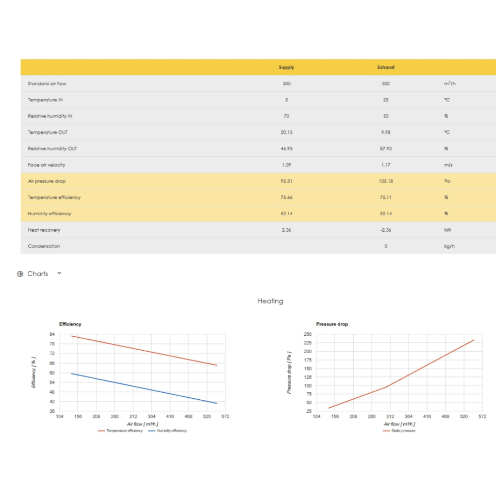 Zum Überblick gehören außerdem drei zentrale Diagramme, die den Vergleich des Verhaltens der Tauscher in Abhängigkeit vom Luftvolumenstrom ermöglichen: